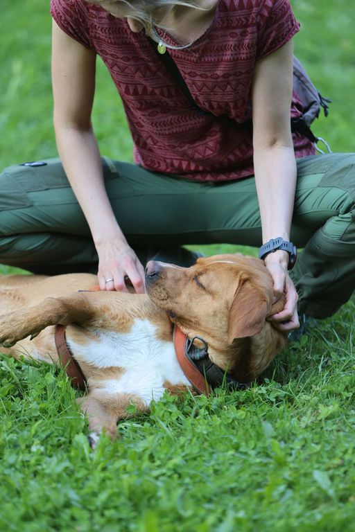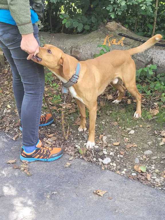 Er ist in vielen Situationen beim Gassi inzwischen ansprechbar und nimmt gerne alternative Verhaltensweisen an. Es war mehrere Male erkennbar, dass Mo sich langsam wieder traut zu kommunizieren (Um