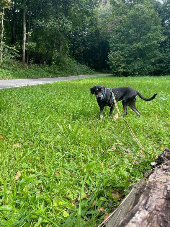 Andere Hunde findet er gut und er läuft auch schon recht gut an der Leine und ist begeistert, wenn er bei uns zum Spazieren gehen raus darf.