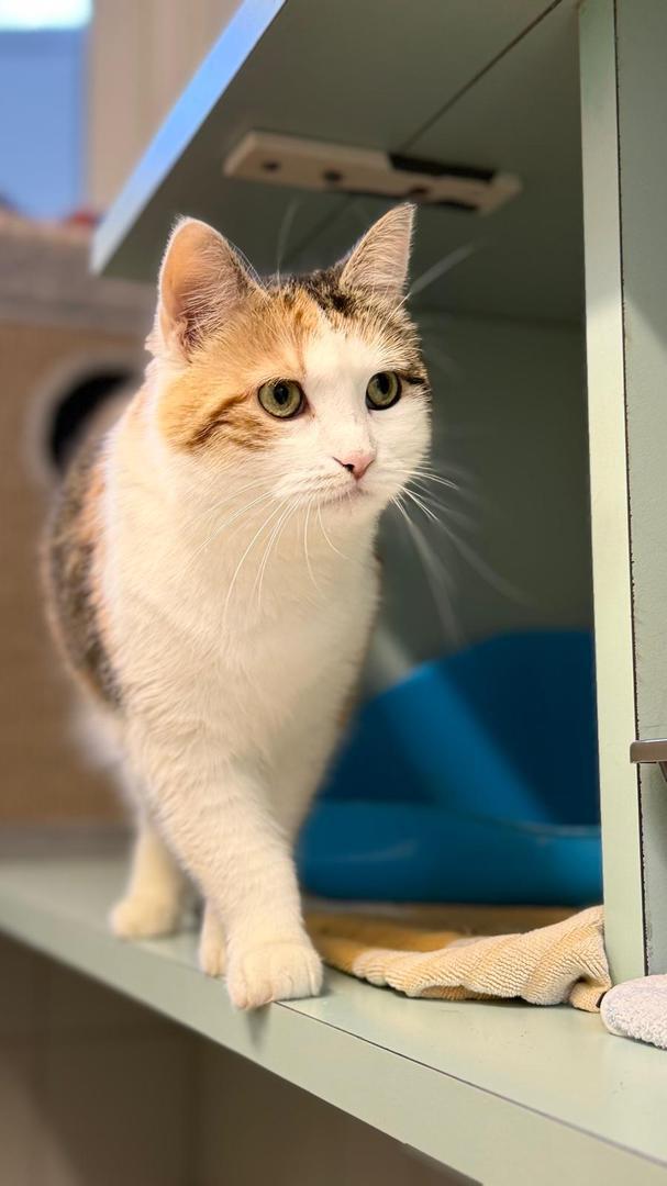 Im Tierheim hält sie sich überwiegend in ihrer Katzenstube auf, im Außenbereich fühlt sie sich sehr unsicher.