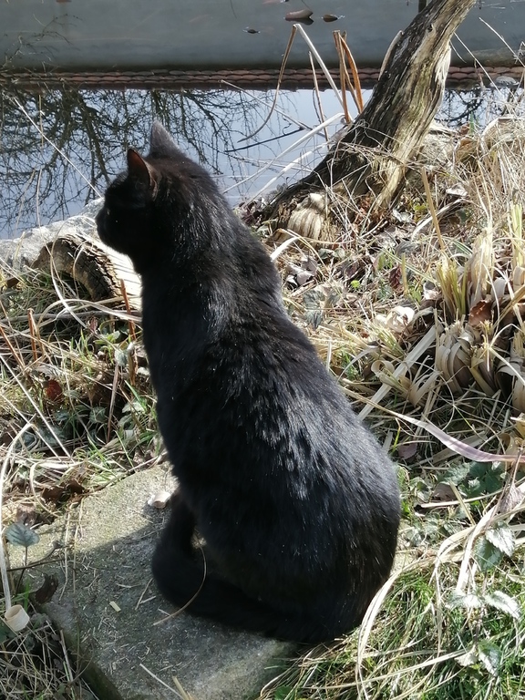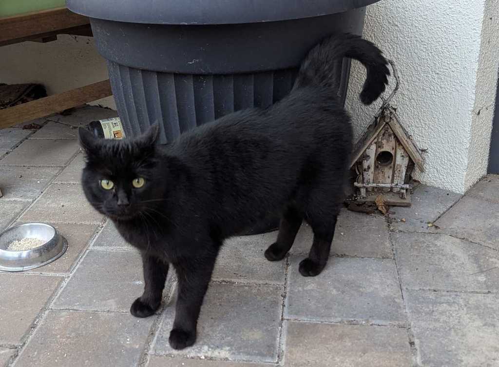 Diese schwarze Katze (Geschlecht unbekannt, da er oder sie sich nicht so gerne ans Hinterteil fassen lässt, evtl. ein kastrierter Kater) streunert seit